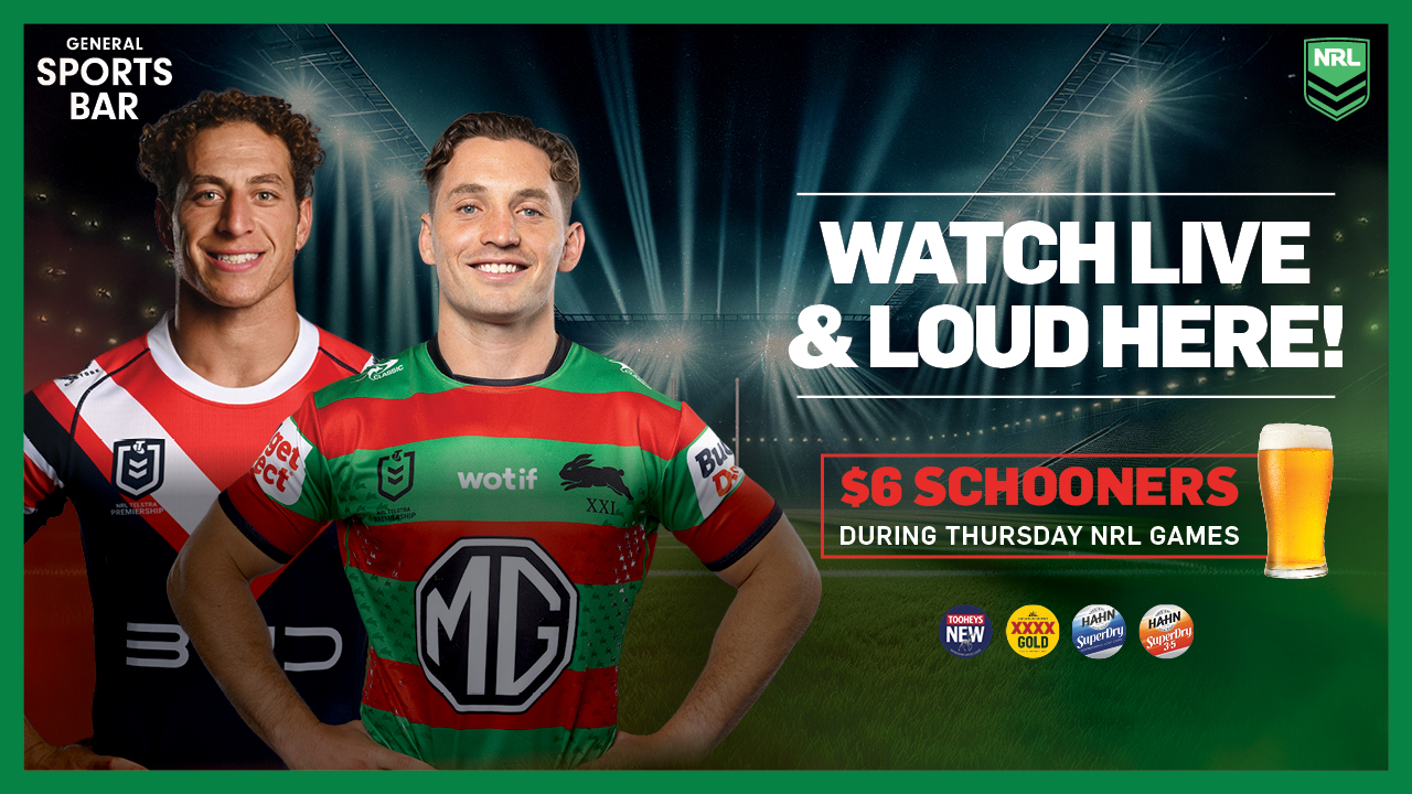 Watch the 2026 NRL footy season live & loud with $6 selected schooners during live Thursday night games!