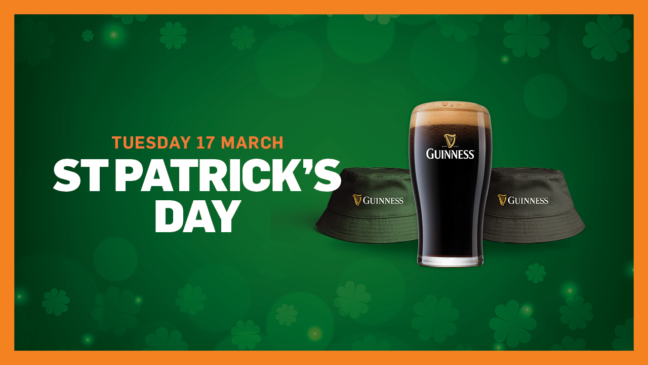 Get lucky on Tuesday 17 March with $11 Guinness pints ALL DAY! Plus, buy 2 pints of Guinness and score a FREE Guinness hat.
